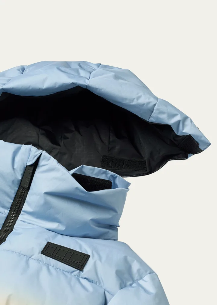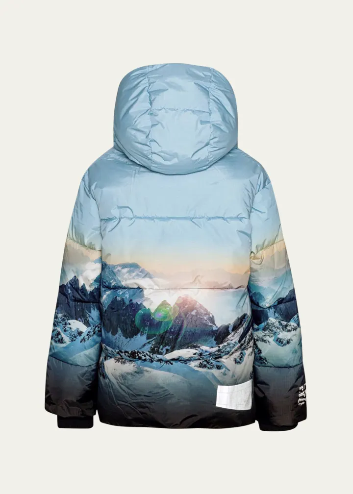 The Molo “Halo” puffer jacket features a vibrant sunrise mountain motif, adding a bold and adventurous look to your outerwear. It is designed with a hooded neckline for extra warmth and long sleeves with banded cuffs for a snug fit. The jacket includes a zip front with a chin guard for added comfort, along with welt pockets for convenient storage. The straight hem adds a clean finish. Made from a durable polyester blend, this jacket is imported and perfect for staying warm and stylish during colder months.