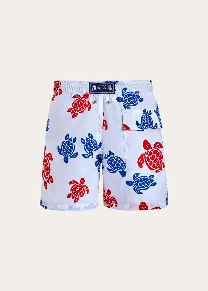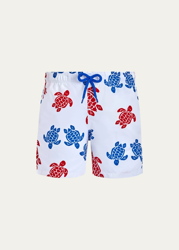 The Vilebrequin swim trunks feature a vibrant multicolor turtles motif, adding a playful touch to your beachwear. They are designed with an elasticized drawstring waistband for a comfortable and adjustable fit. The trunks include side slip pockets for convenience and a flap pocket at the back for extra storage. The hem falls above the knee for a flattering fit. Made from a durable blend of nylon and polyamide, these swim trunks are crafted in Morocco, offering both style and quality.