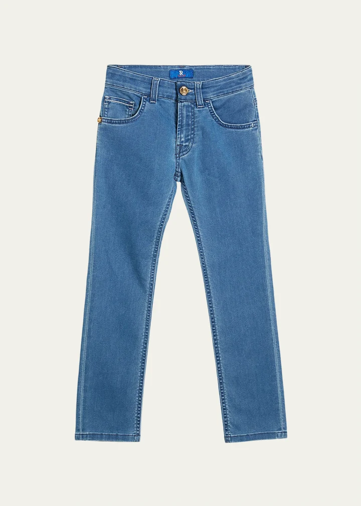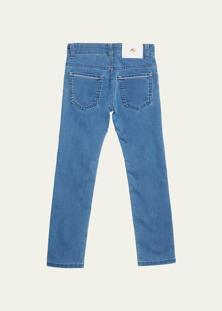 Stefano Ricci presents stylish boy’s denim jeans, crafted for both comfort and durability. Designed with a classic button and zip fly along with belt loops, these jeans feature a traditional five-pocket style and straight-leg fit. Made from a blend of cotton and spandex, they offer a soft feel with a hint of stretch for easy movement. Expertly crafted in Italy, these jeans reflect the brand’s commitment to quality and timeless design.