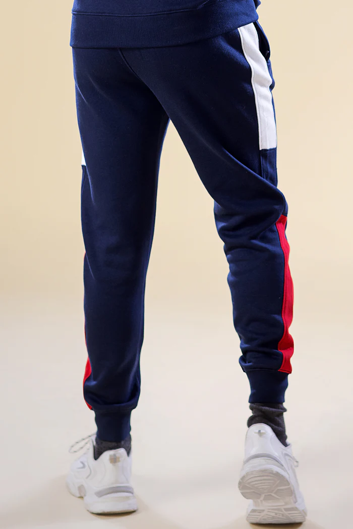 Introducing the Essentials Navy Blue Winter Trouser — the perfect blend of style and function for the modern man. Crafted with soft fleece to keep you warm and comfortable during colder months, this trouser features a bold white, red, and blue color-blocked side panel for a standout look. Made from premium-quality fabric, it ensures flexibility and comfort, perfect for both casual wear and active lifestyles.