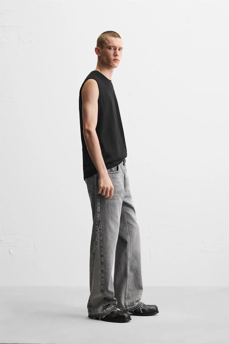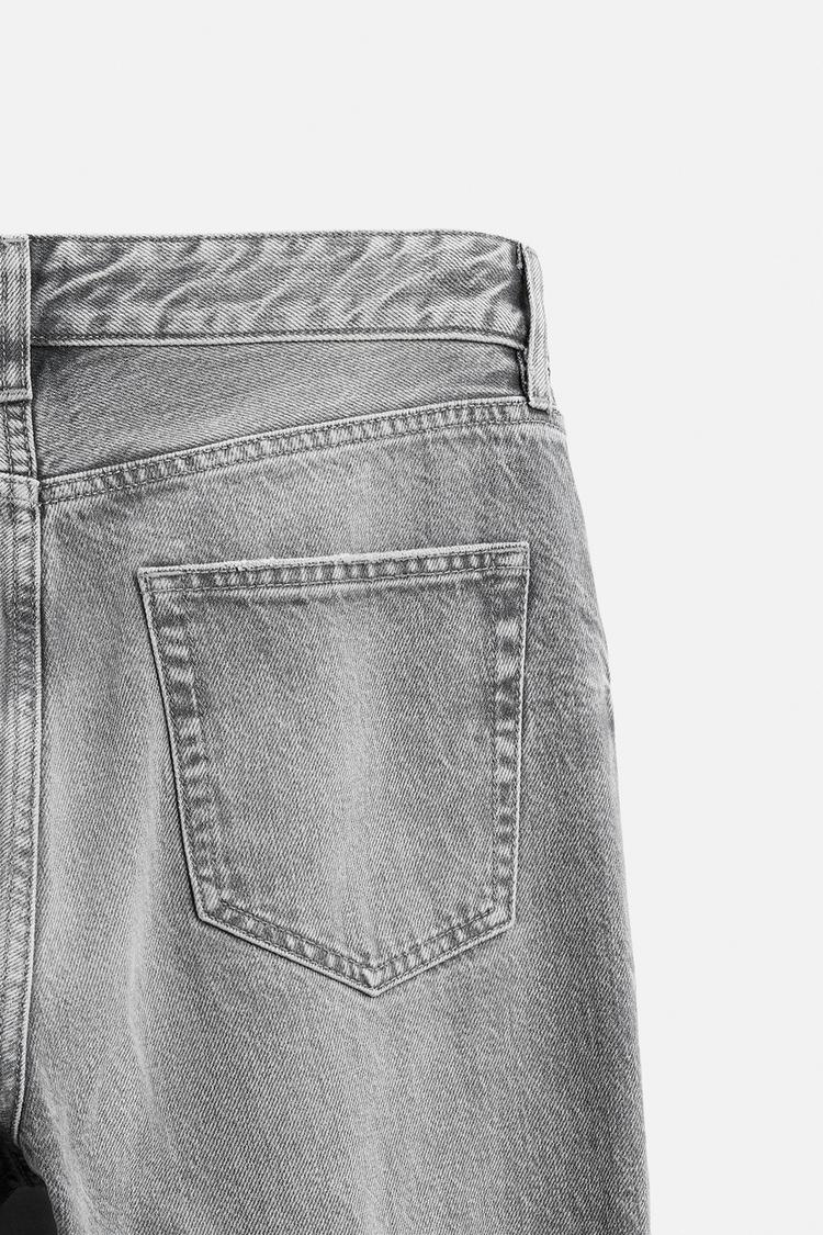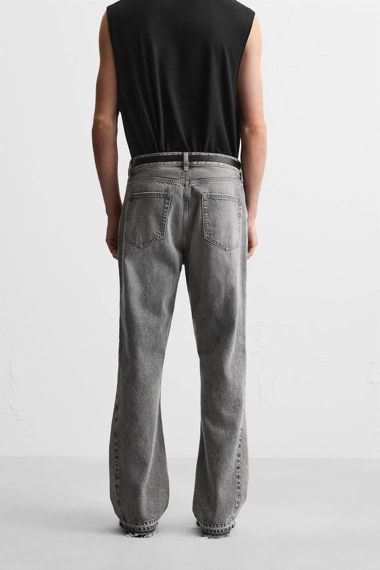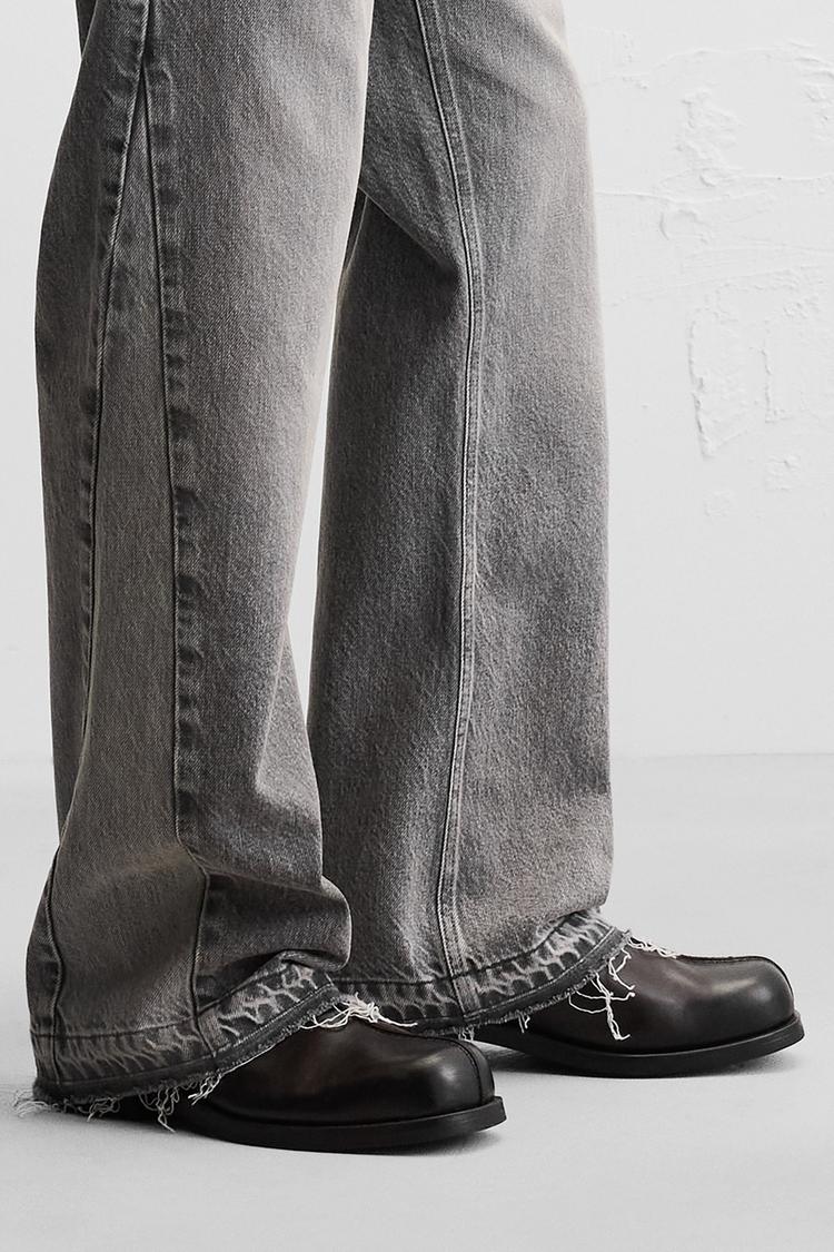 Flare-fit jeans crafted with a washed effect, featuring five-pocket styling and a raw, uneven hem. Finished with a classic front zip and button closure.