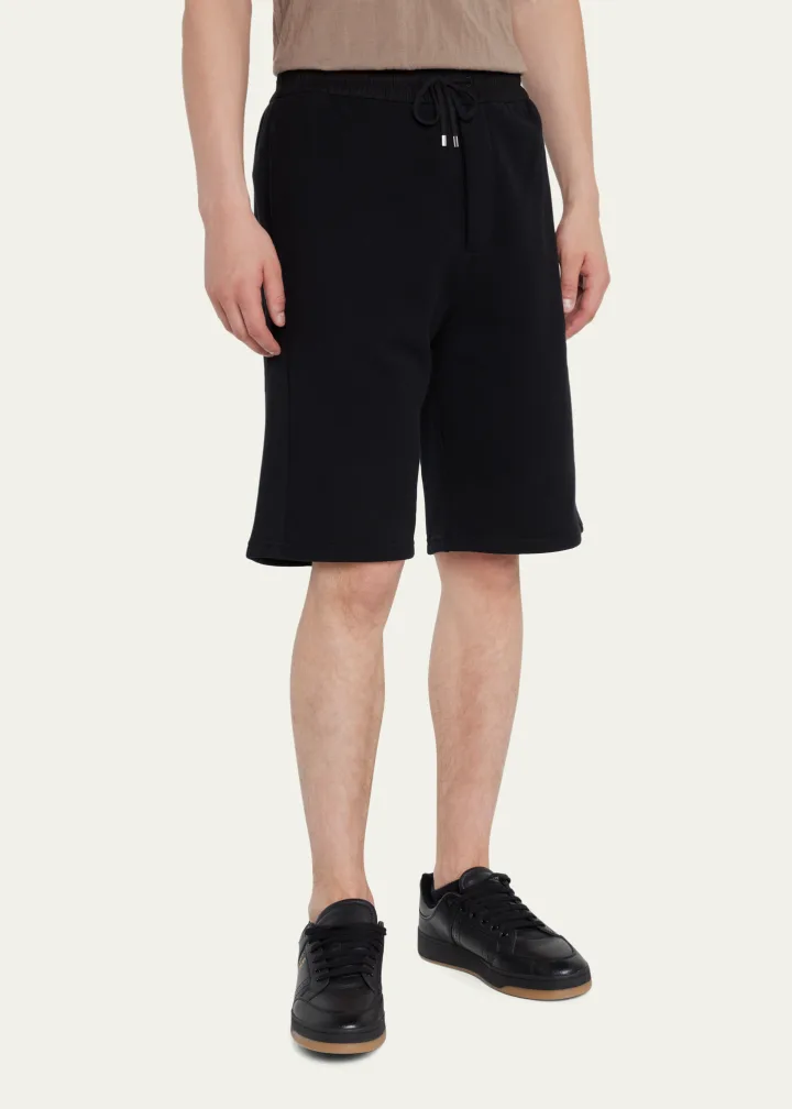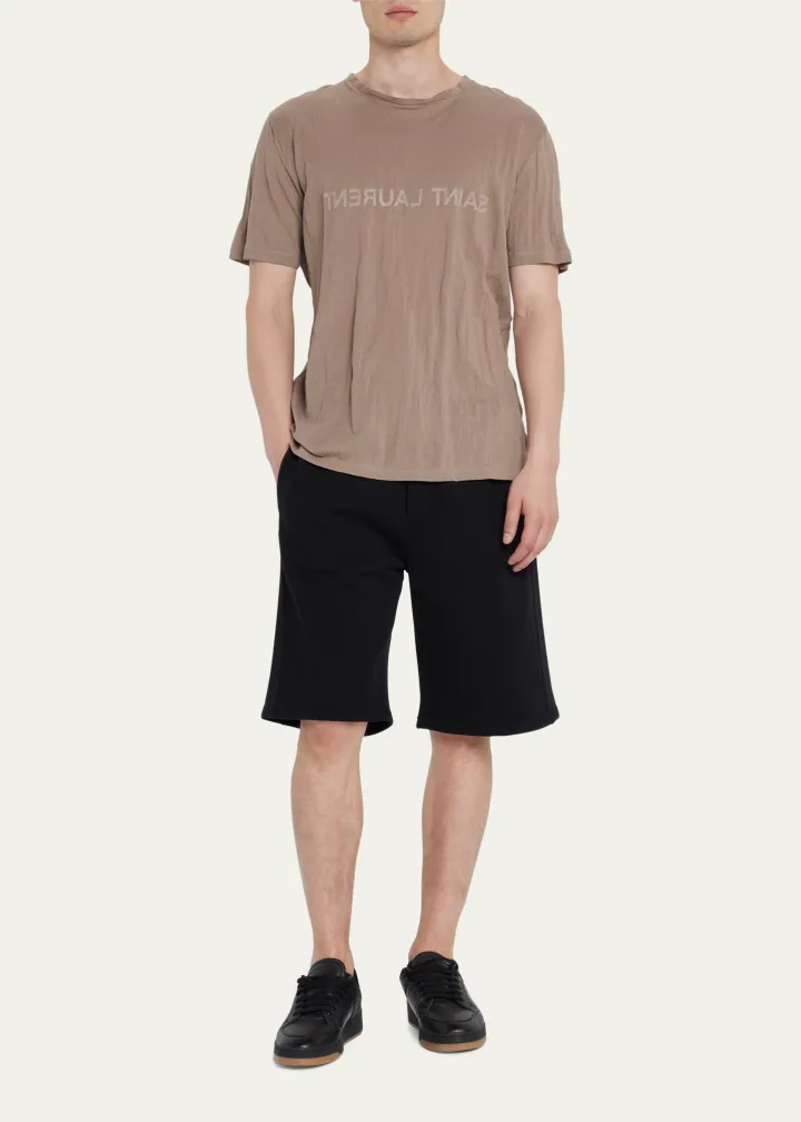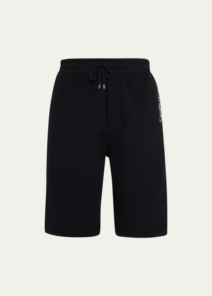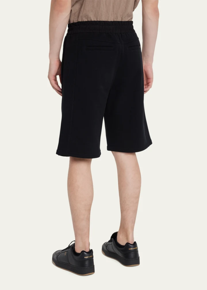 The Saint Laurent sweat shorts feature a sleek design with an embroidered logo at the side for a subtle, stylish touch. They are designed with an elasticized drawstring waist for a comfortable and adjustable fit, along with side slip pockets and back patch pockets for practicality. The shorts have straight legs and a knee-length cut, offering a relaxed pull-on style. Made from premium cotton and crafted in Italy, they combine comfort with luxury. The model showcasing these shorts is 6’1″ (185 cm) tall.