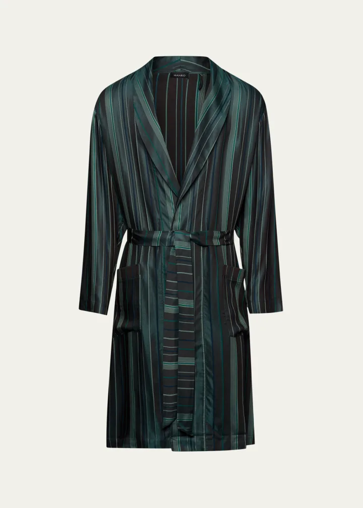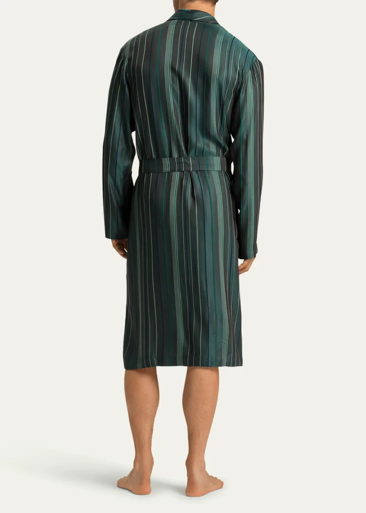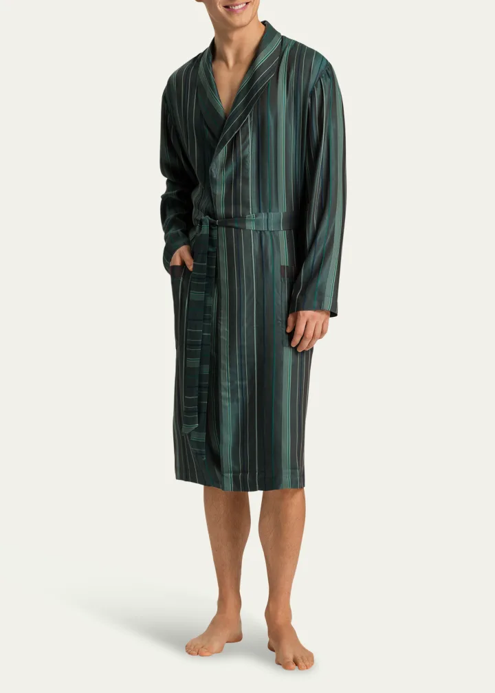 The Hanro “Selection 140th Anniversary” luxury robe is crafted from a silk-viscose woven fabric featuring an elegant multi-stripe print. It is designed with classic shawl lapels, a V-neckline, and a self-tie sash for adjustable comfort. The robe includes hip patch pockets and long sleeves, offering both style and functionality. With its relaxed fit, it provides a comfortable and luxurious feel. Made from a blend of silk and cotton, this robe is produced in Portugal with fine craftsmanship. For reference, the model wearing it is 6’1″ (185 cm) tall.