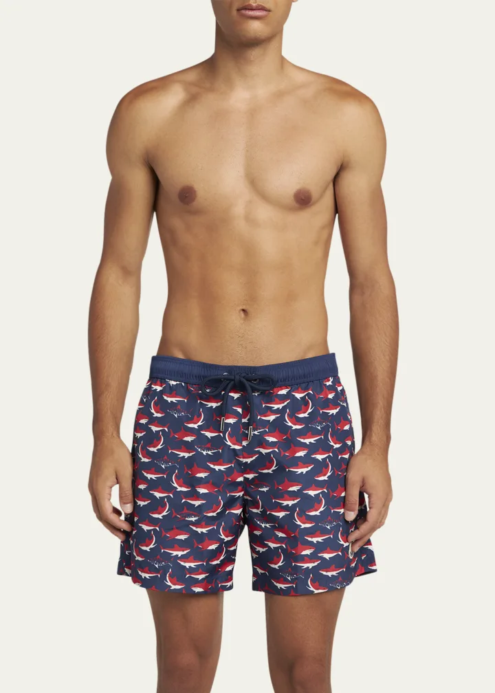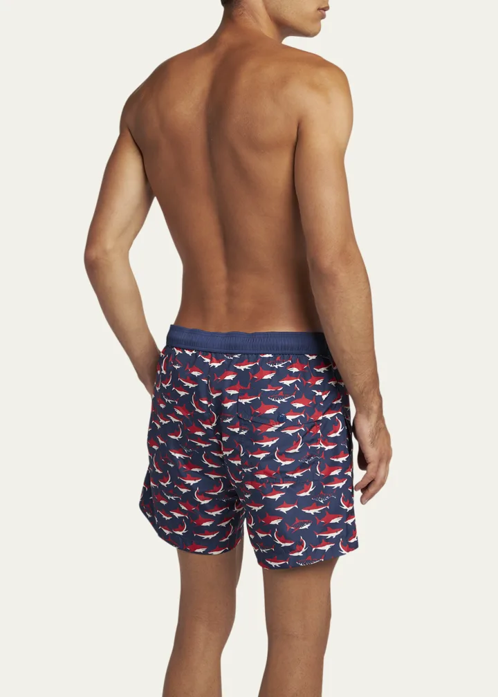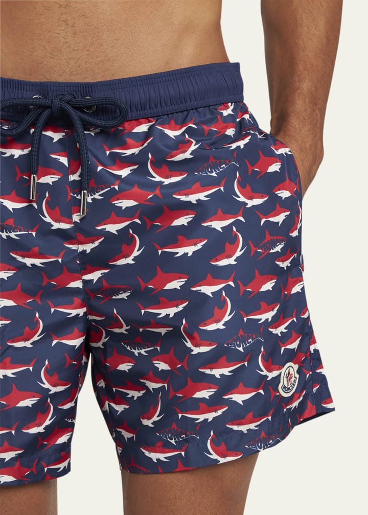 The Moncler swim shorts feature an eye-catching shark print, bringing a bold, dynamic style to your swimwear. They are designed with an elasticized drawstring waist for a comfortable and adjustable fit, along with a regular rise. The shorts include side slip pockets for convenience and a back flap pocket for added functionality. A classic Moncler logo patch at the front hem adds a signature touch. Made from a blend of polyester, nylon, and polyamide with a nylon lining, these swim shorts are imported, offering both style and quality.