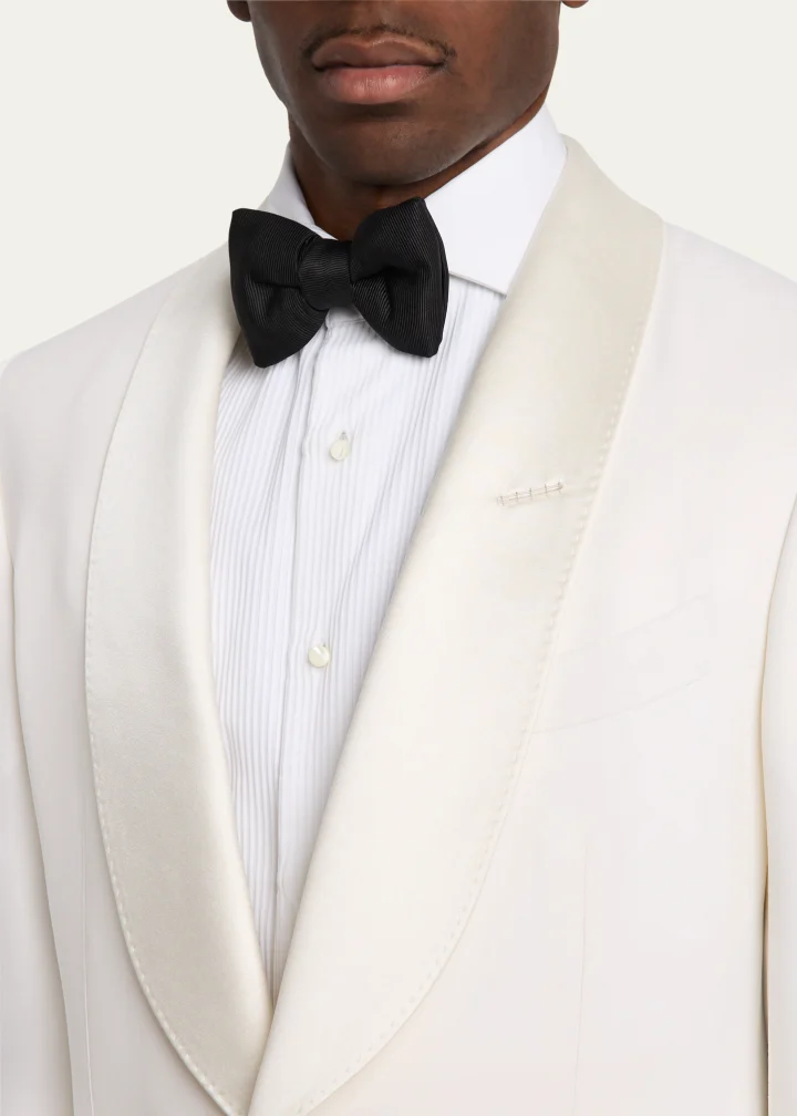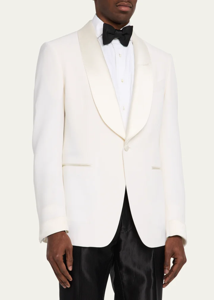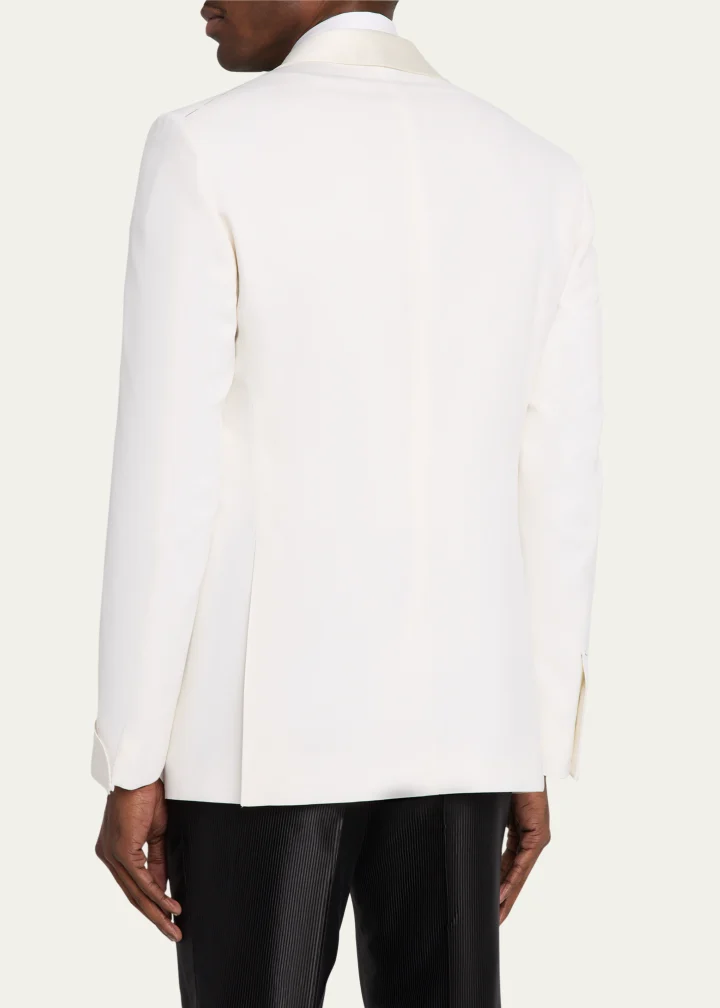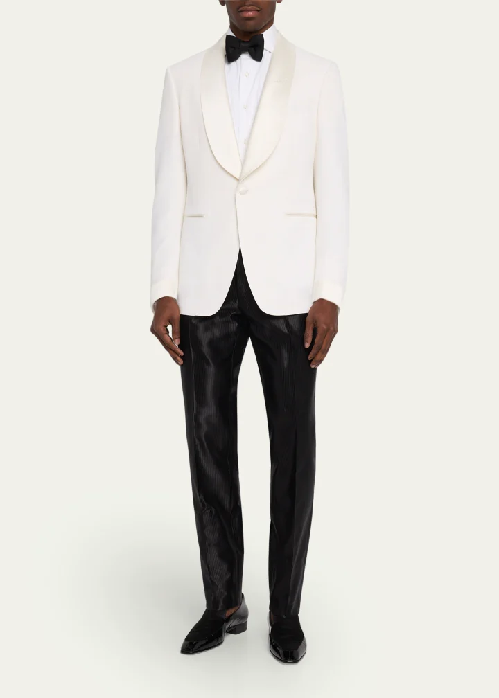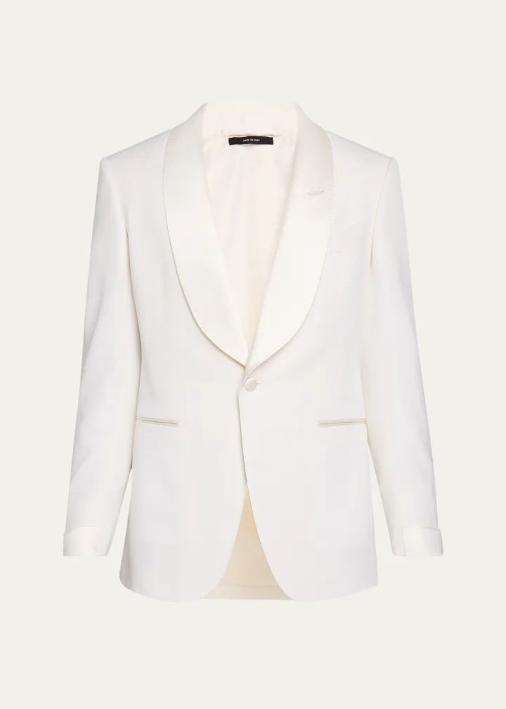 The TOM FORD “Shelton” solid dinner jacket offers a luxurious and polished look with its elegant satin trim. It features classic shawl lapels, a single-button closure, a chest welt pocket, and hip besom pockets for a clean, sophisticated appearance. The design is further enhanced with turnback cuffs and a double-vented back for added comfort and style. Crafted from a premium blend of wool and mohair, and lined with cupro and silk, this jacket ensures a refined fit and feel. Proudly made in Italy, it reflects TOM FORD’s dedication to exceptional craftsmanship.