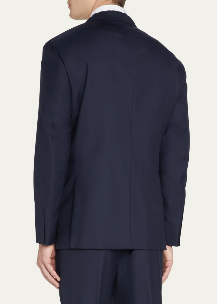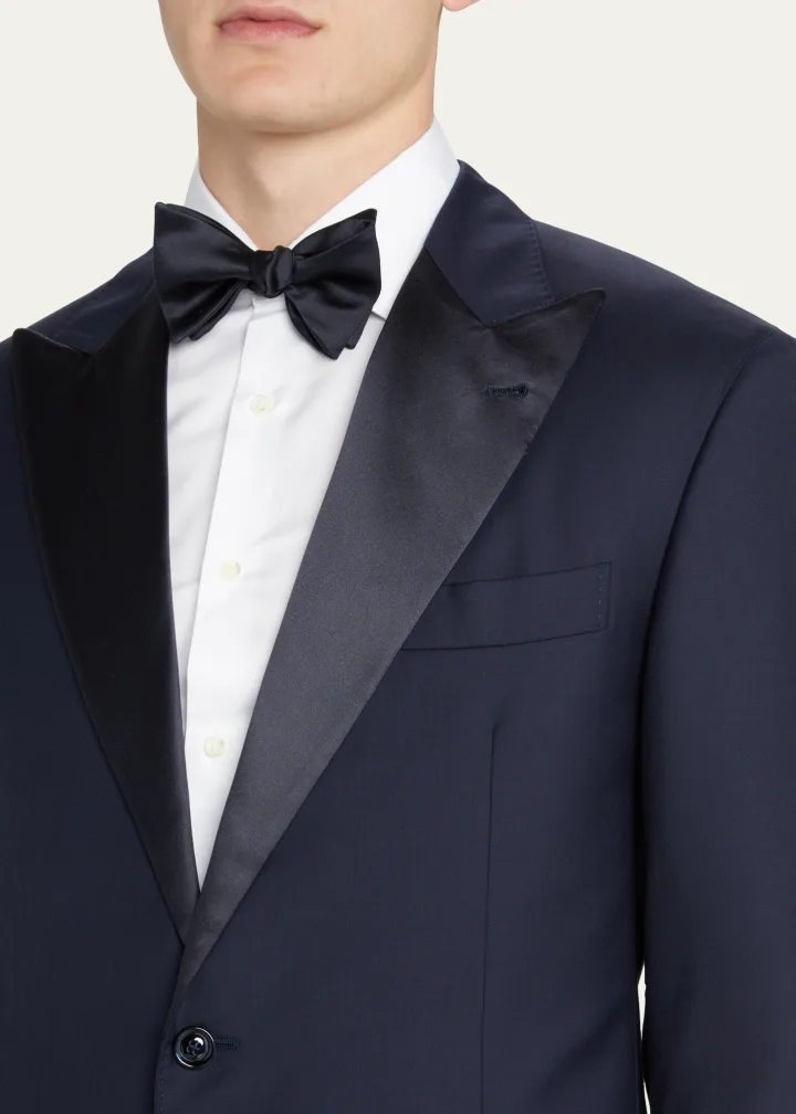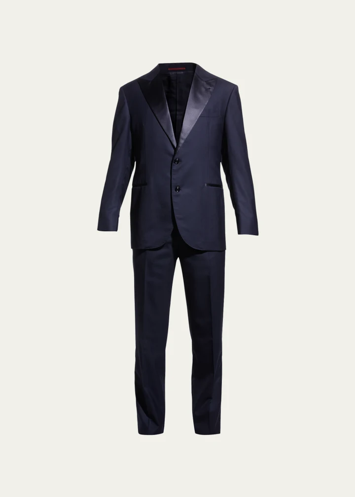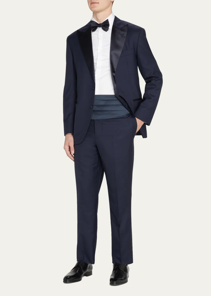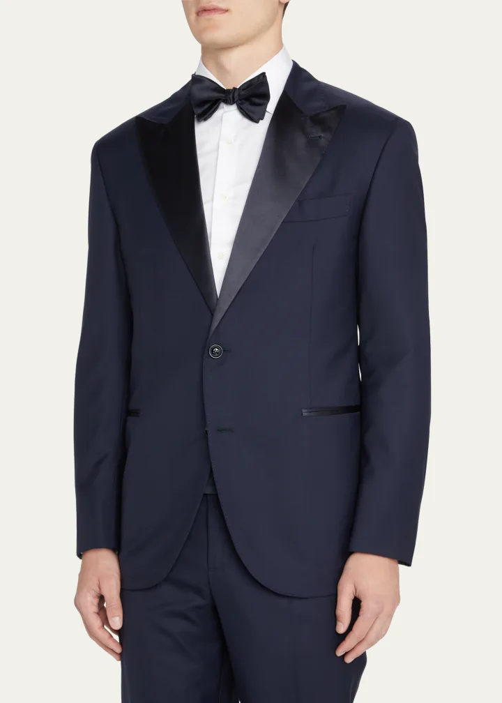 The Brunello Cucinelli solid tuxedo, accented with tonal satin trim, offers a timeless and refined look. Designed with a classic fit, it is crafted from a luxurious blend of virgin wool and silk, ensuring both comfort and elegance. The jacket features peak lapels with a buttonhole on the left side, a two-button closure, a chest welt pocket, side besom pockets, and an interior pocket with a button closure. It also includes unfinished sleeves and a double-vented back for easy movement. The trousers are designed with a regular rise, a flat front, side pockets, back welt pockets, and a full-length silhouette. Made in Italy, this tuxedo reflects superior craftsmanship. For reference, the model is 6’2″ tall with a 34-inch inseam and a 30-inch waist, wearing a size 48R.