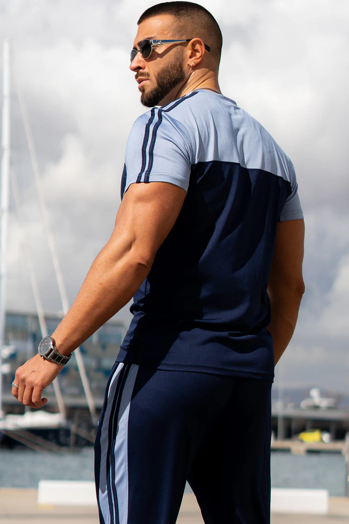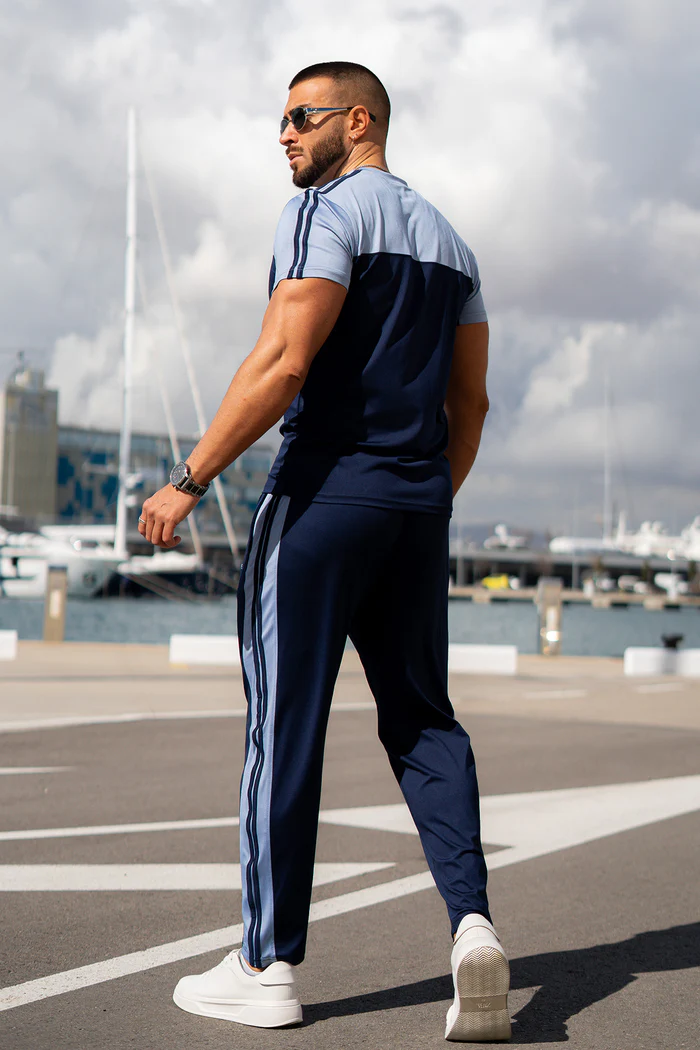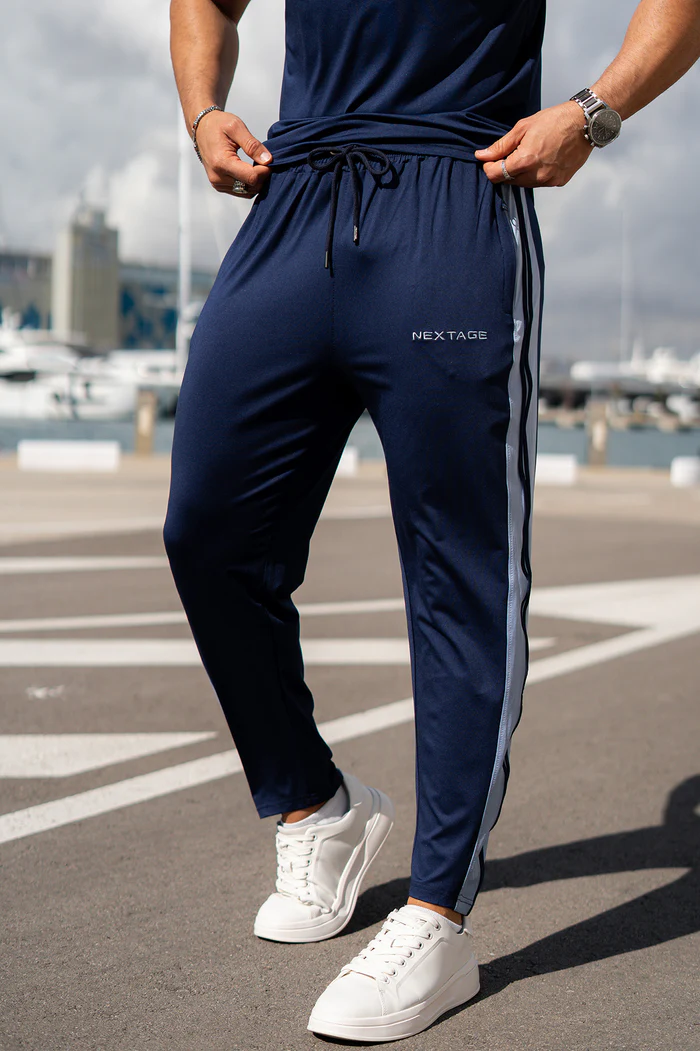 Combining performance with style, the Nextage Navy Luxe Stretch Dri-Fit Tracksuit delivers a sleek, athletic look, enhanced by contrast side stripes for a dynamic touch. Crafted from an ultra-stretch dri-fit fabric blend, it offers superior breathability, flexibility, and moisture-wicking comfort—perfect for workouts, casual outings, or everyday wear.