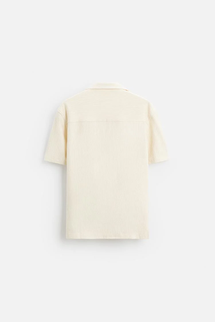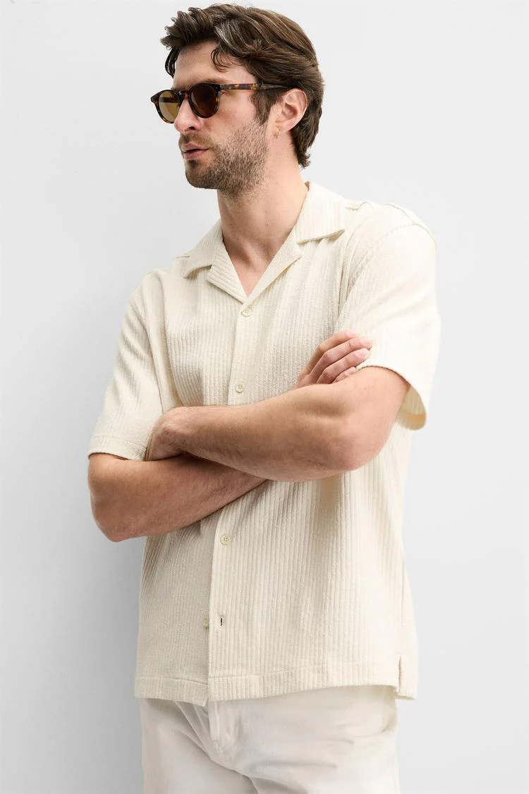Relaxed fit shirt product of textured crepe material. Spread collar and brief sleeves. Side vents at hem. Front button closure.