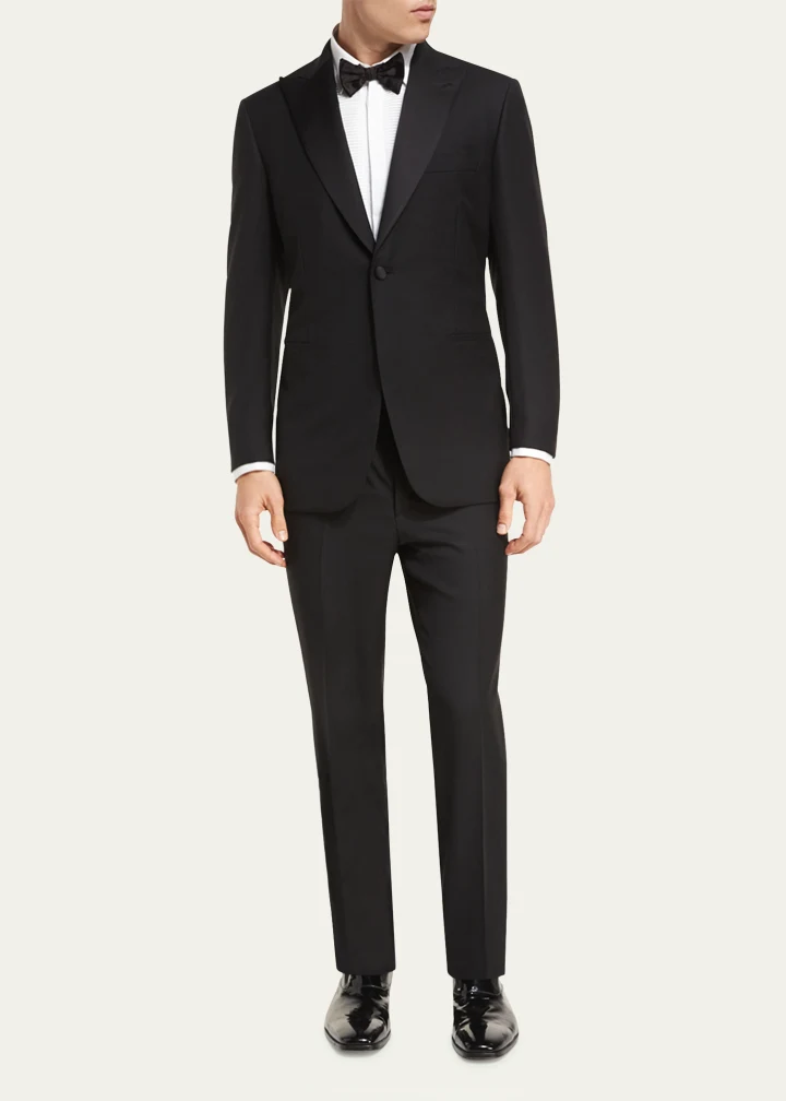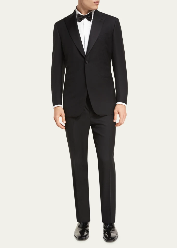 The Brioni two-piece tuxedo suit is a symbol of elegance and craftsmanship. It features a peak lapel and a single-button front, complemented by lightly padded natural shoulders for a refined shape. The jacket includes basted sleeves for custom tailoring, a welt pocket at the chest, and besom pockets at the sides, along with a double-vented back for ease of movement. The suit comes with matching flat-front trousers designed with a straight leg and an unfinished hem, allowing them to be tailored to the perfect length. With a slim fit silhouette, this tuxedo is crafted from luxurious wool and is handmade in Italy, reflecting Brioni’s tradition of fine tailoring.